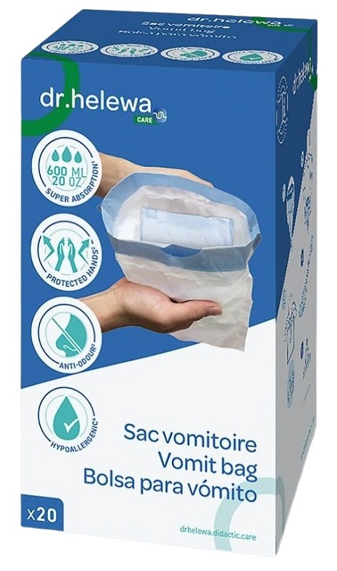 Absorbent vomit bag, perfect for emergency interventions (first aid, fire brigade) and on any occasion of transport, travel, and in particular in the healthcare sector.