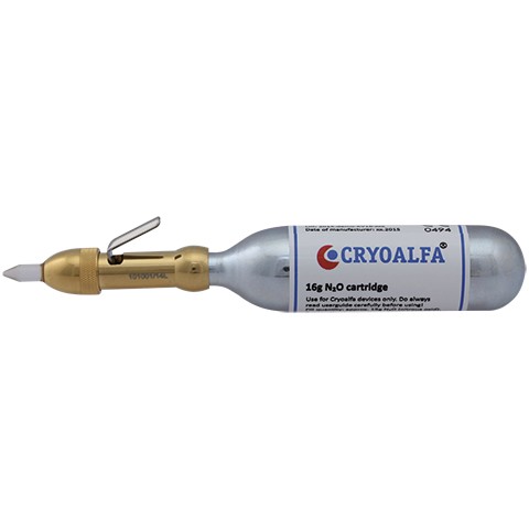 CryoAlfa es un sistema de criocirugía muy preciso que utiliza gas N2O líquido contenido en cartuchos de 16 o 25 g con válvula de seguridad reemplazable.