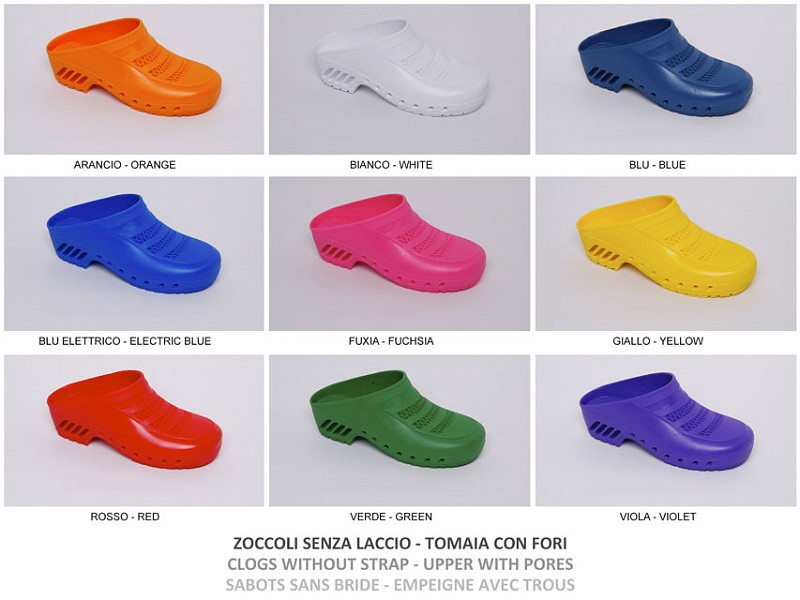 ZUECOS PROFESIONALES GIMA FABRICADOS EN ITALIA • color/talla a petición (PEDIDO MÍNIMO 50 PARES) • PARTE SUPERIOR CON O SIN AGUJEROS - material antiestático inyectado directamente en la mezcla de polímeros - agujeros en la suela para ventilación y transpirabilidad - suela antideslizante segura incluso en suelos mojados - lavable a máquina, esterilizable a 134°C - disponible con correa de seguridad - envasados individualmente en caja de cartón - sin látex