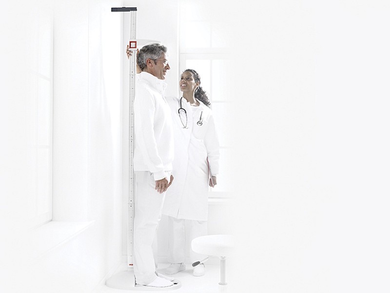 Stadiometro mobile per misurare l'altezza, semplice e facilmente trasportabile grazie alla maniglia integrata.