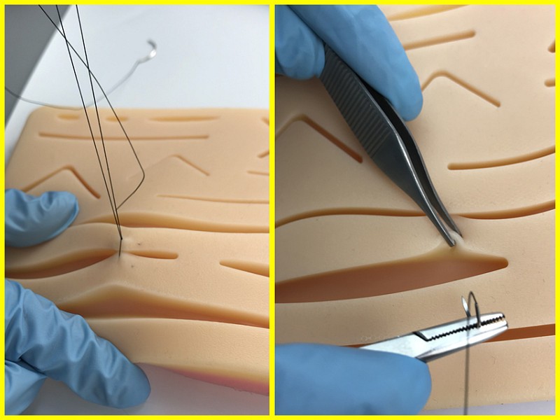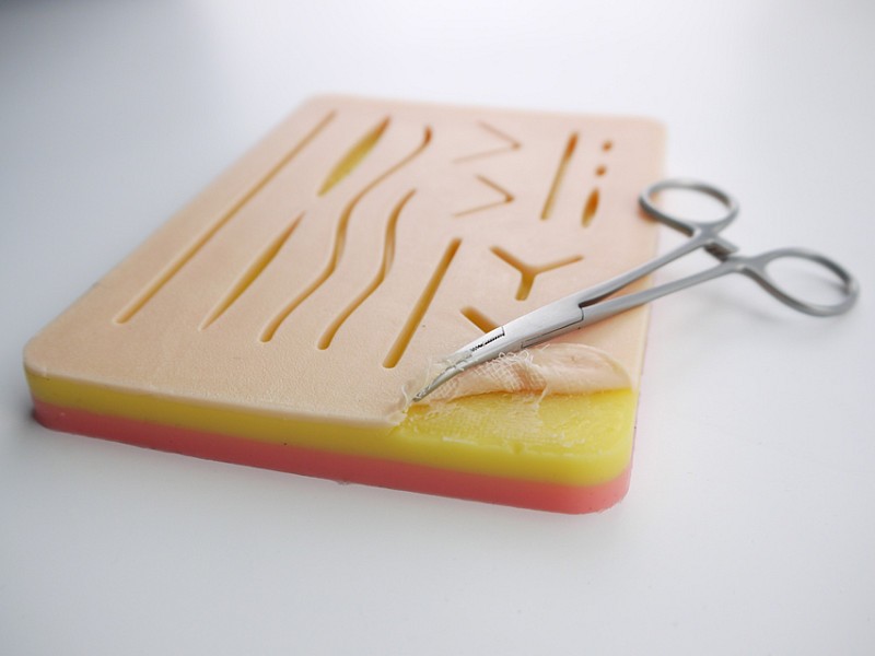 Cuscino simulatore per suture in silicone, con 14 ferite.