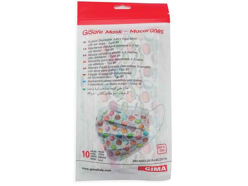 Gisafe mascherina chirurgica filtrante 98% 3 veli tipo iir con elastici - adulti - macarones - flowpack - conf. 10 pz.