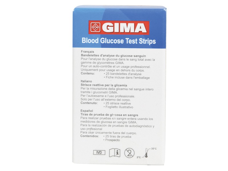 Strisce glucosio per glucometro GIMA. Confezione da 25 strisce. Periodo di validità massimo: flaconcino chiuso 24 mesi, flaconcino aperto 18 mesi.