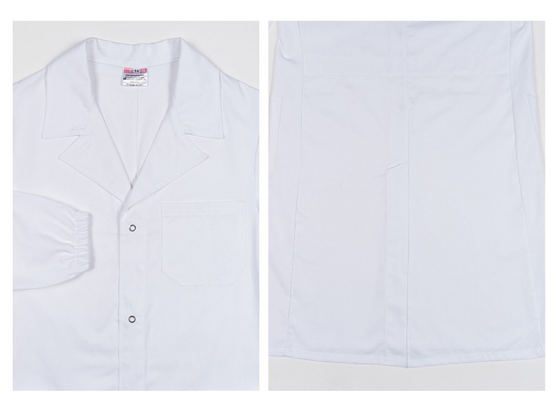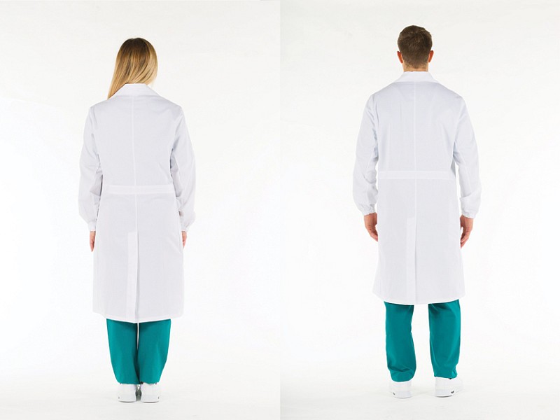 I camici bianchi hanno 2 tasche laterali, 1 tasca sul petto, un cinturino e uno spacco posteriore.