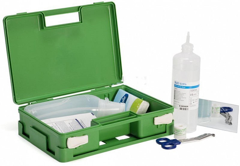 Cassetta in polipropilene con supporto a parete,maniglia per trasporto e chiusura con clip rotanti. Contenuto necessario per un primo intervento oculare d'emrgenza. Conforme CE 93/42 Colori disponibili : verde / arancio / bainco