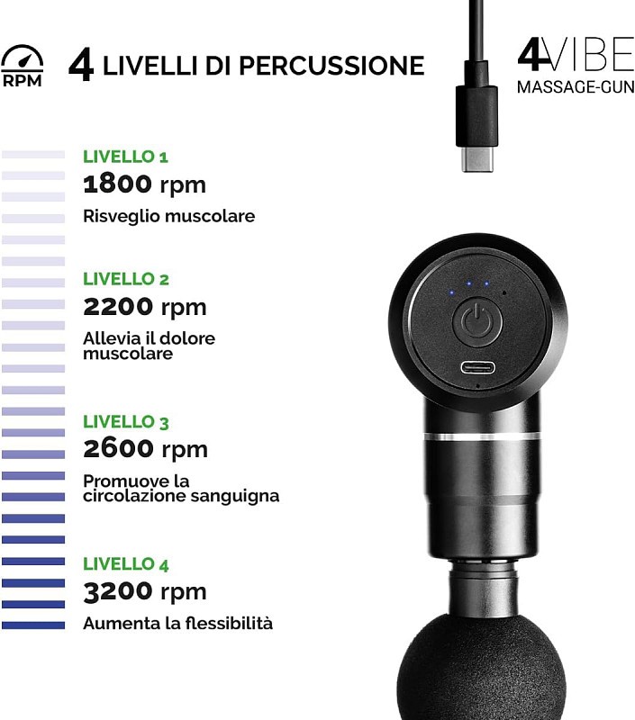 Globus 4 Vibe massaggiatore costruito in alluminio, con 4 diversi livelli di velocità e dotata varie testine per assicurare la massima efficacia sulle diverse parti del corpo che si vanno a trattare e a seconda delle esigenze. Pistola massaggi ideale per rilassamento muscolare, il massaggio profondo e per il recupero post attività fisica.