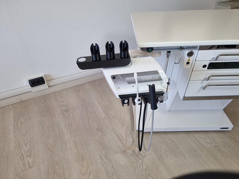 Nel braccio articolato con tavoletta portastrumenti trovano alloggiamento la cannula terminale per l’insufflazione e la siringa per il lavaggio auricolare (un microprocessore mantiene una temperatura costante di 37° C).