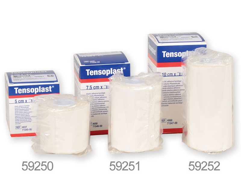 BENDE TENSOPLAST® • Codice BSN: 71546-00 • Dimensioni: 4,5 m x 7,5 cm Bende adesive elastiche. Tessuto elastico di alta qualità, bordi morbidi e materiale adesivo poroso. Riga centrale gialla. Garantiscono un sostegno e una compressione forti in caso di traumi e problemi flebologici. Lunghezza in estensione: 4,5 m Scatola multilingue: GB, FR, IT, ES, DE, PT, GR, NL, SE.