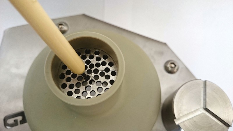 Dotato di uno statore con fori calibrati a 2mm e fresature profonde 0,5 mm per creare attrito sul prodotto da frantumare, ed evitare lo slittamento impresso dal rotore azionato dal motore elettrico.