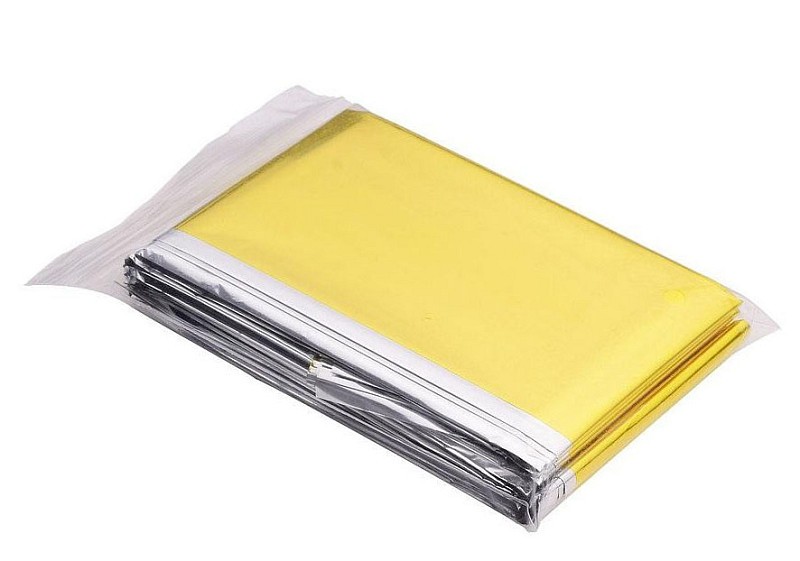 Telo isotermico in polietilene per emergenza argento/oro. Il lato dorato protegge il paziente dal caldo. Il lato argentato lo protegge dal freddo.