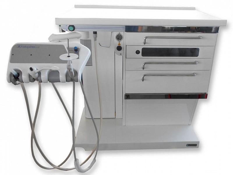 Dotato di 3 cassetti (2 piccoli ed 1 grande) con comodi scomparti interni amovibili, 1 cassetto con lampada germicida per la sterilizzazione degli strumenti.
