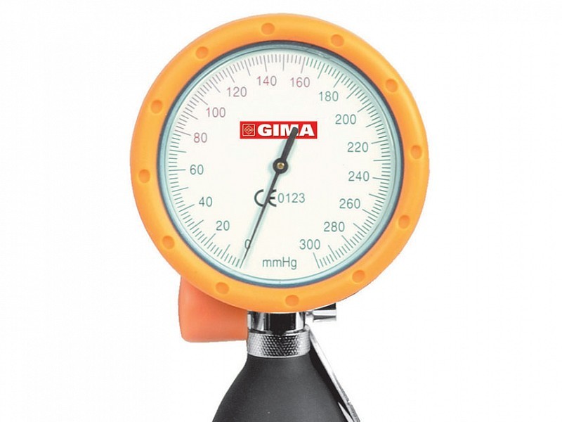 Sfigmomanometro da palmo con anello antiurto in silicone arancione, e valvola rilascio aria arancione. Tubo in PVC e tubo polmone in TPU, latex free.