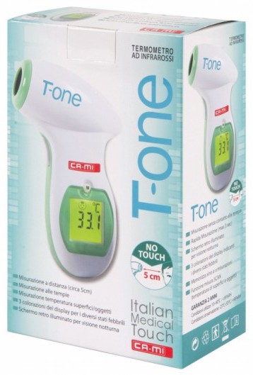 T-One è un termometro ad infrarossi no-touch ovvero che rileva la temperatura corporea a distanza (5 cm dalla superficie corporea), in modo rapido ed accurato.