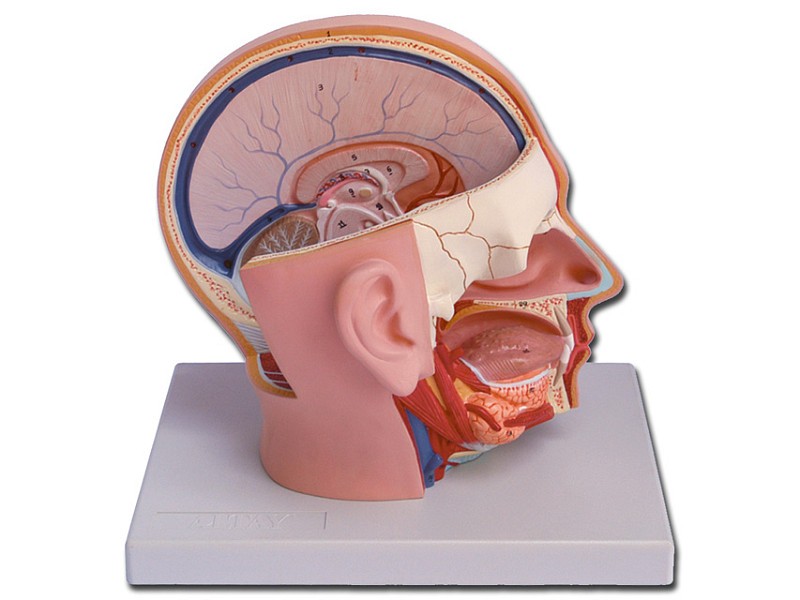 Il lato destro della faccia è sezionato lungo la linea orizzontale e sagittale. Questo modellino anatomico molti dettagli significativi del cervello a del cranio assieme all'intera cavità oro-nasale.