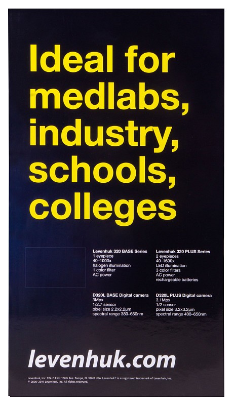 Il microscopio Levenhuk 320 PLUS è un modello da laboratorio per osservazioni professionali. È idoneo per eseguire ricerche morfologiche, ematologiche, biochimiche e molte altre ancora, presso laboratori di istituti medici e centri scientifici e di ricerca. Assistenti e professori universitari possono avvalersi del Levenhuk 320 PLUS per le proprie lezioni agli studenti di medicina e professioni sanitarie.