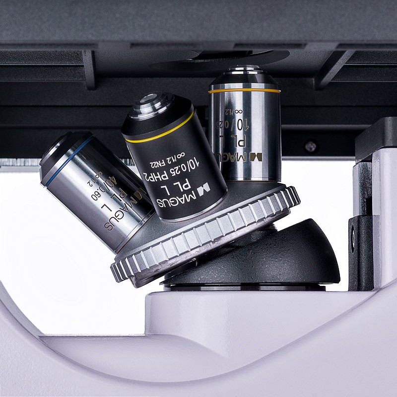 Quattro obiettivi inclusi o altri acquistati separatamente possono essere alloggiati sul revolver portaobiettivi. Tutti gli obiettivi inclusi sono progettati per l’uso con vetreria da laboratorio e hanno una lunga distanza di lavoro. Nello specifico, sono inclusi 3 obiettivi planacromatici per le osservazioni in campo chiaro e 1 obiettivo planacromatico per microscopia a contrasto di fase.