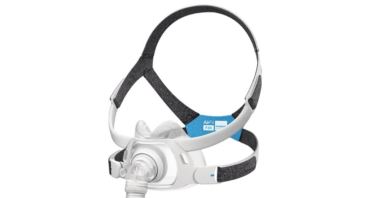 La maschera ResMed AirFit F40 è una maschera oro-nasale per ventiloterapia con fori per l’esalazione della CO2 incorporati (non necessita perciò di valvole espiratorie aggiuntive).