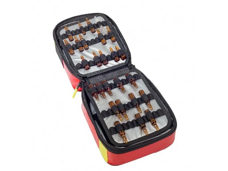 Può contenere fino a 128 fiale di diverse dimensioni ( adrenalina, gel e iniezioni). L'interno isotermico protegge dalla temperatura esterna. Inoltre, essendo imbottito su tutti i lati, protegge il contenuto dagli urti.