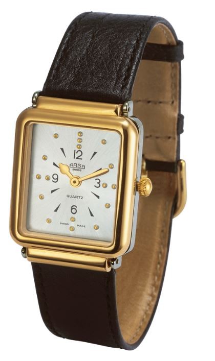 Orologio tattile per ciechi, (non vedenti), modello Unisex, con cassa rettangolare bicolore in acciaio e oro piccola