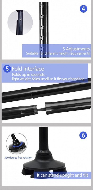 Praktičnost i prenosivost: zahvaljujući sklopivom dizajnu koji se sastoji od 4 dijela, ovaj je štap za hodanje iznimno kompaktan i jednostavan za spremanje. Možete ga udobno nositi u automobilu, ispod sjedala u zrakoplovu ili u ruksaku na putovanjima. Izrađen od izdržljive aluminijske legure, lagan je, ali čvrst i nudi neusporedivu lakoću transporta.