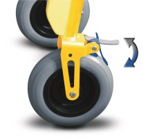 Dotata di 4 ruote diametro 200 mm di cui 2 fisse con freno e 2 girevoli realizzate con materiale morbido, caratteristica che consente un maggior comfort su pavimentazioni sconnesse.