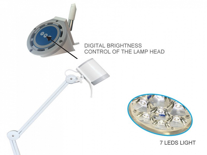 Lampade a 7 LED 10W per operazioni medicali, su carrello con braccio morbido flessibile o braccio metallico a pantografo.