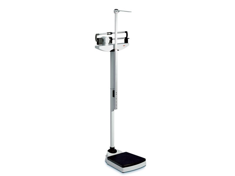 Balança mecânica de coluna com detecção de peso na altura visual. O peso é medido convencionalmente alinhando as duas rodas de equilíbrio cromadas.