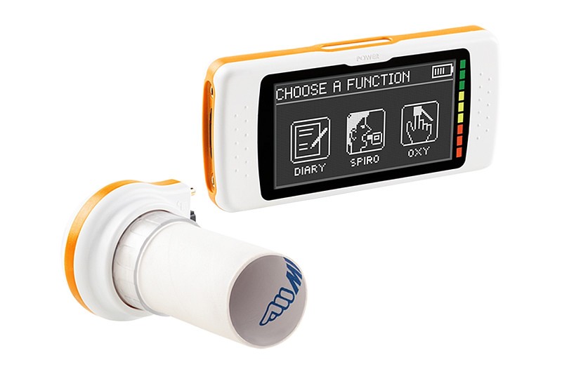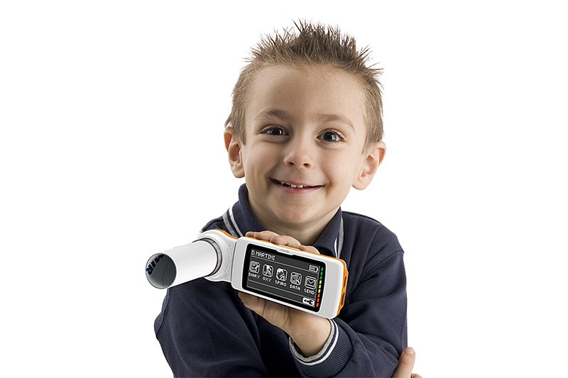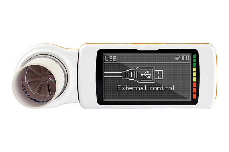 Espirômetro portátil com tela sensível ao toque. Configurável para uso em consultório médico e residencial.