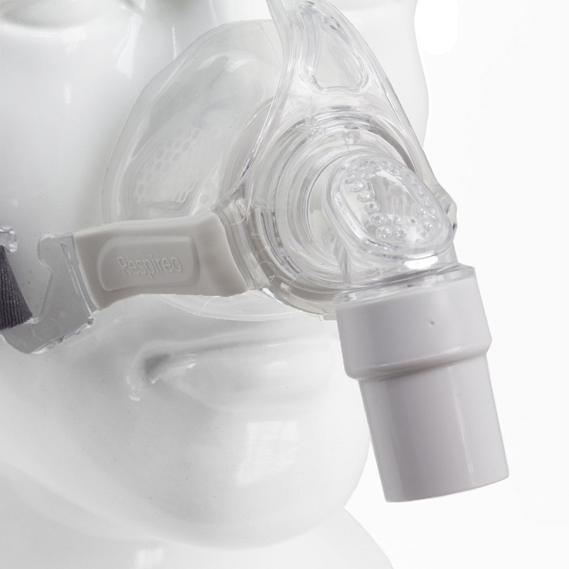 Cuscino con raccordo tecnologia SOFT, contorni del naso atti a ridurre pressione sul ponte nasale, che è un'area molto sensibile . I ganci si posizionano vicino al viso per migliorare la stabilità e la tenuta all'aria con impostazioni delicate del copricapo. Visione sul campo aperta per migliorare l'indipendenza.