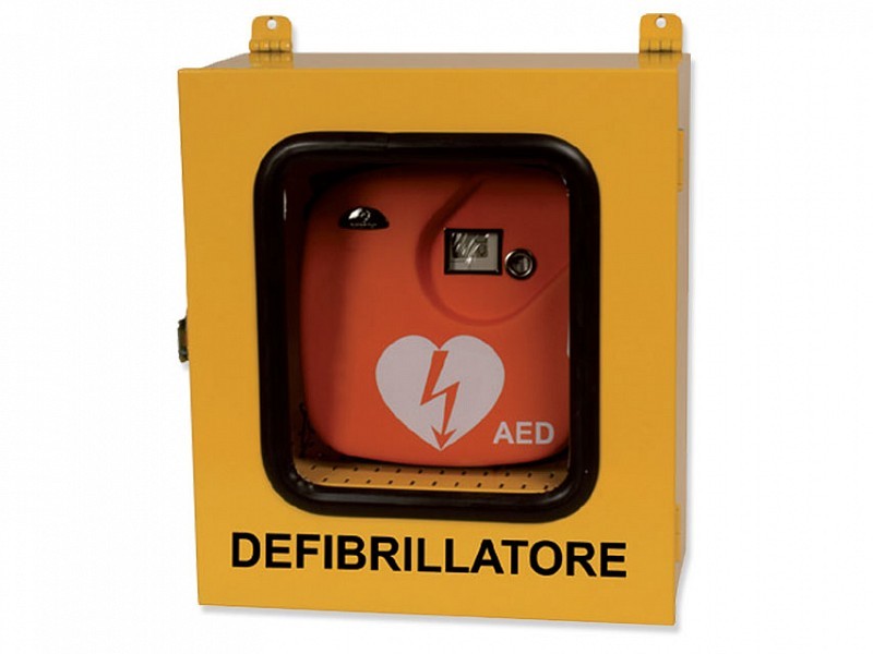 Armadietto in metallo per defibrillatori, uso esterno. Saldature a tenuta stagna su tutti i lati, guarnizioni a tenuta acqua e polvere. In acciaio di carbonio, spessore 15/10. Ripiano interno regolabile.