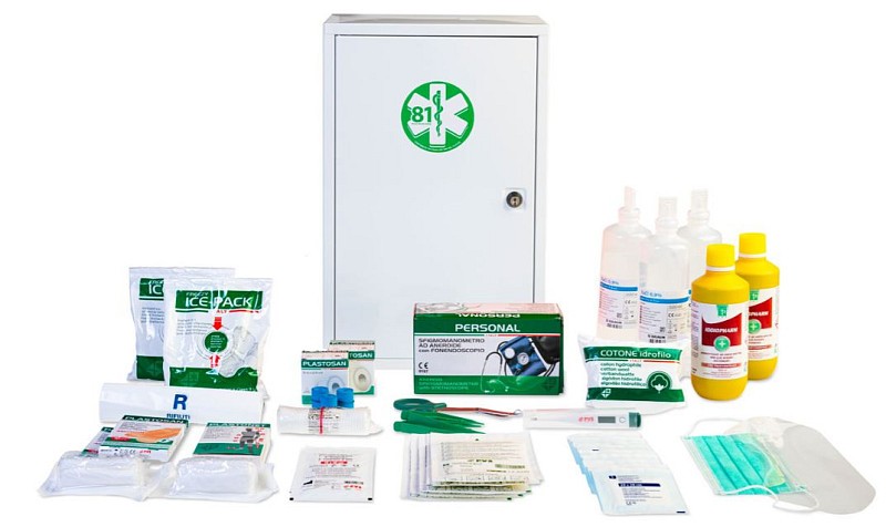 Armadietto in METALLO “102/M” verniciato con polvere epossidica colore bianco, 3 vani, 2 ripiani interni, serratura con chiave. Per aziende o unità produttive del gruppo A e B e comunque con 3 o più lavoratori. Indicata per piccole aziende commerciali, automezzi di servizio.