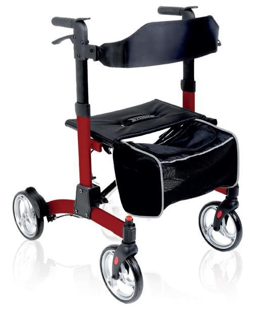 Rollator pliabil din aluminiu vopsit pentru utilizare în interior/exterior, cu spătar căptușit.