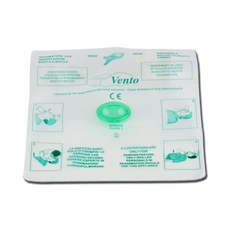 Aparat za oživljanje usta na usta za enkratno uporabo s polikarbonatnim enosmernim ventilom in nestrupenim PVC zaščitnim zaslonom, ki preprečuje kakršno koli okužbo med bolnikom in reševalcem. Na voljo v 2 različicah: v plastični škatli ali v embalaži z obeskom za ključe. Navodila v GB, IT, FR, DE.