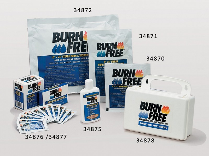Sterilné obväzy na rany a popáleniny: vyrobené z nepriľnavej peny s otvorenými bunkami napustenej v Burnfree géli, nezanechávajú na rane žiadne zvyšky. Mierne elastické, prispôsobivé aj na ošetrenie ohybných partií.